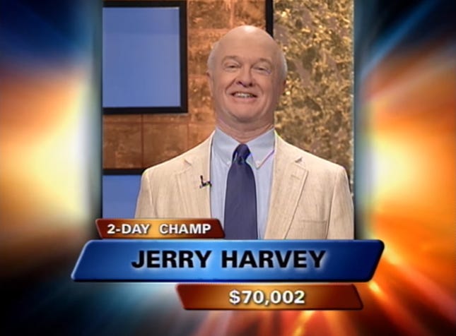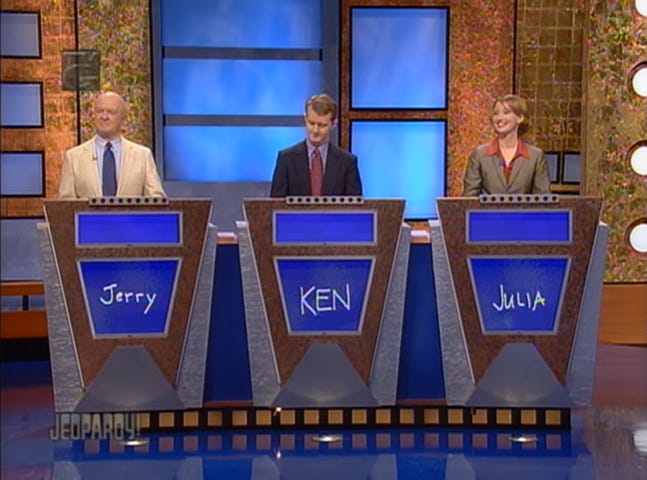 Coming through my TV speakers was the jazzy Jeopardy! theme that ran from 2001 to 2008. This immediately encapsulated my autistic attention, and I stayed on the channel as they introduced the three contestants: Sue McClung, a project manager from Boston on the right, Toby Guebert, a community college instructor from Claremont, and returning champion Jerry Harvey, a freelance educator from California, Missouri. Yeah, apparently there’s a city named California. Anyway, hearing about a returning champion must have kept my curiosity as Alex Trebek walked out to the stage.
